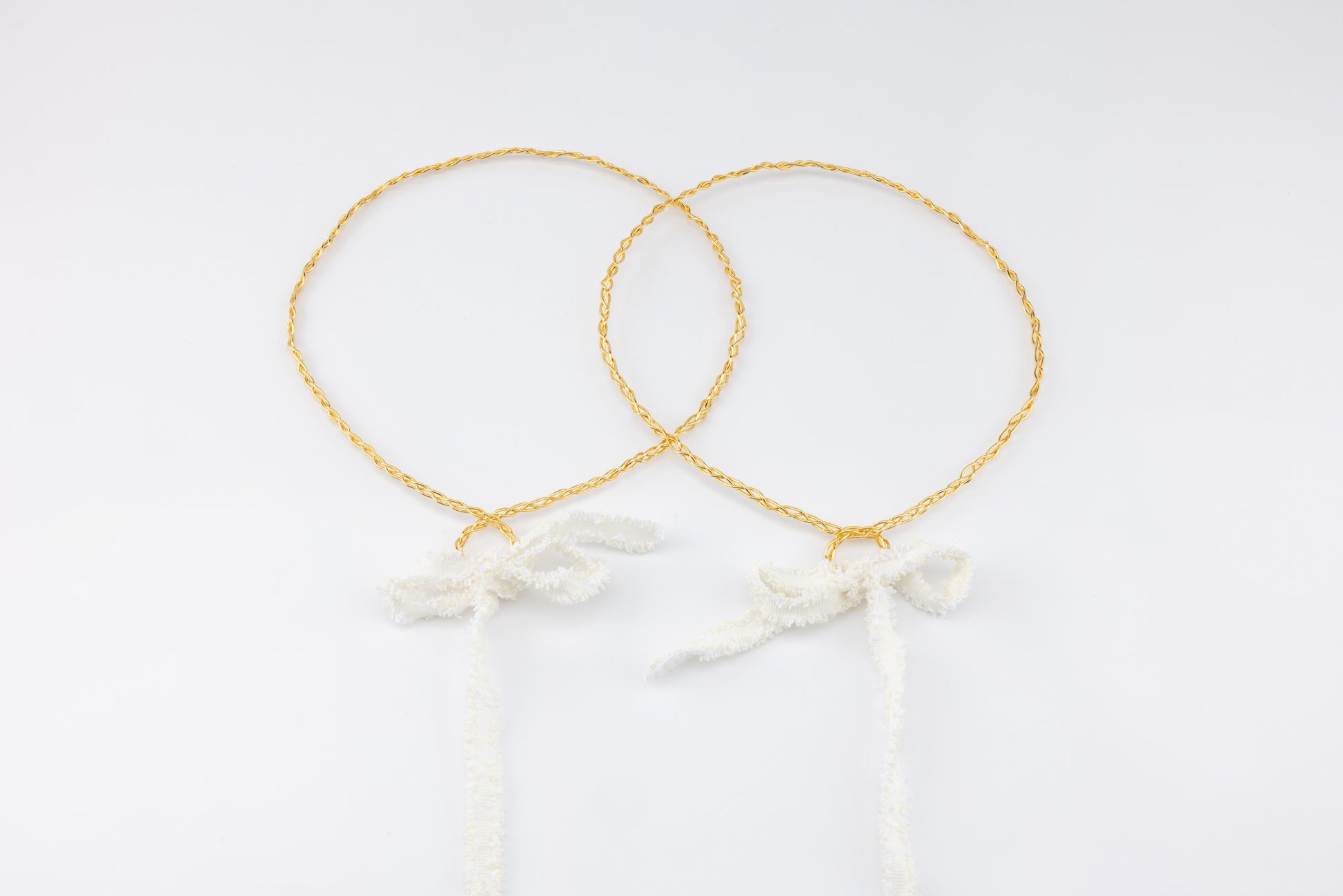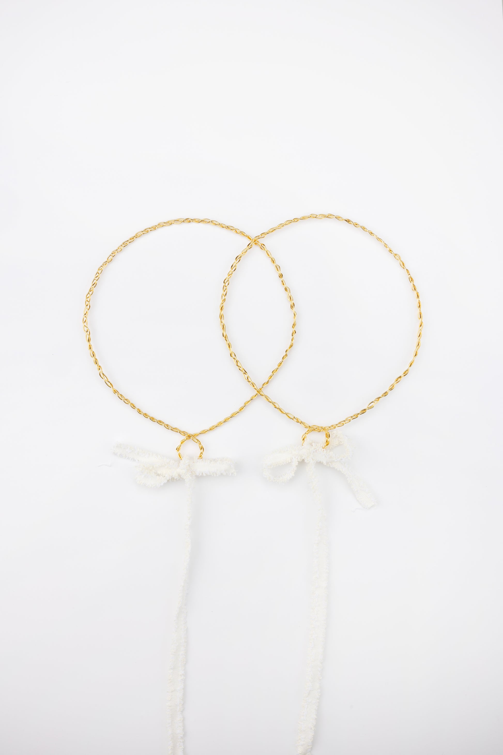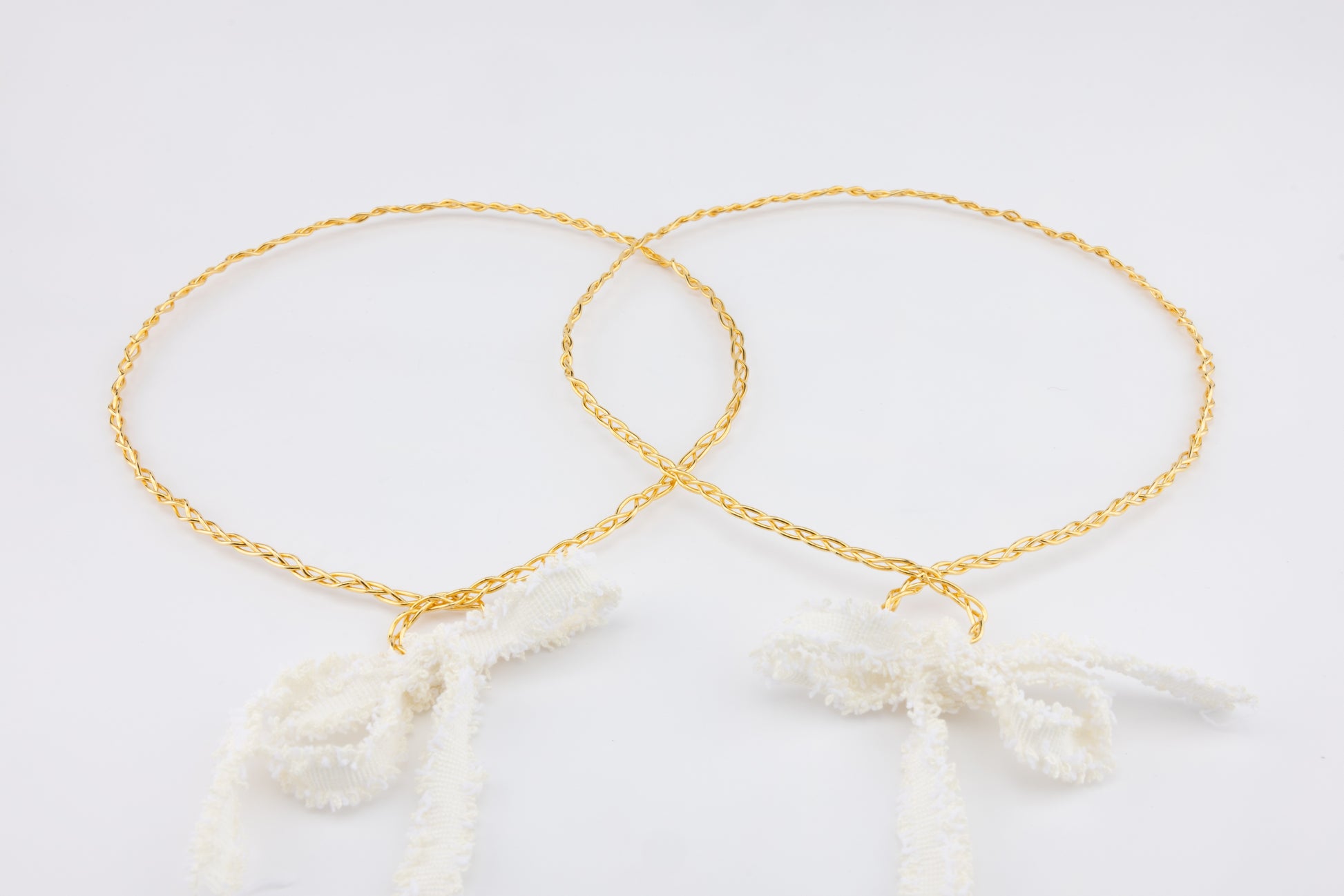 Elegant and timeless, this pair of wedding crowns is crafted from gold-plated bronze, featuring a refined Braid-Style design. Joined together with soft white textured ribbons, they symbolize the eternal bond and unity of marriage. A perfect blend of tradition and sophistication, these handcrafted crowns add a touch of radiant charm to your special day.
