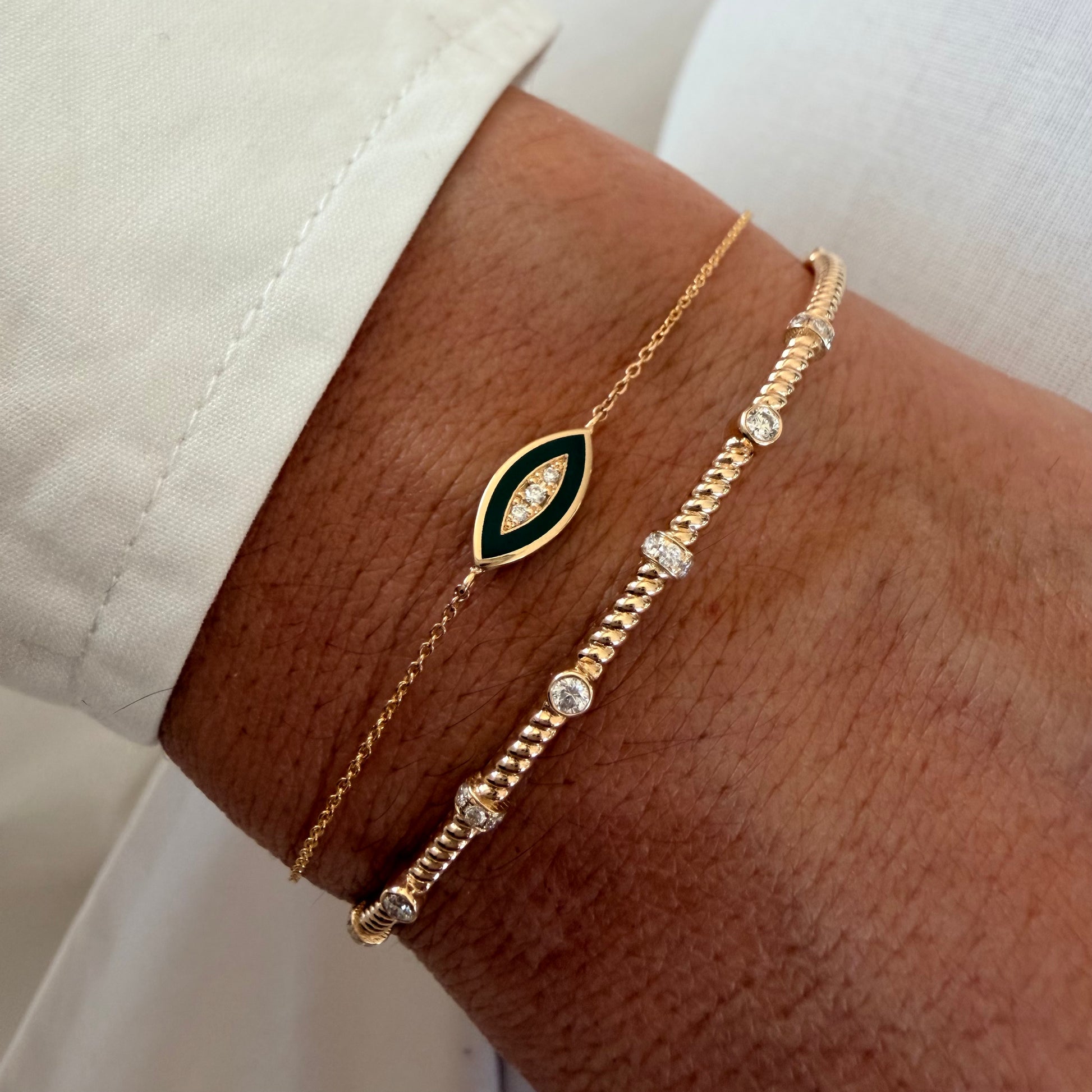 14K Gold Chain Bracelet with Black Navette Enamel Diamond Motif