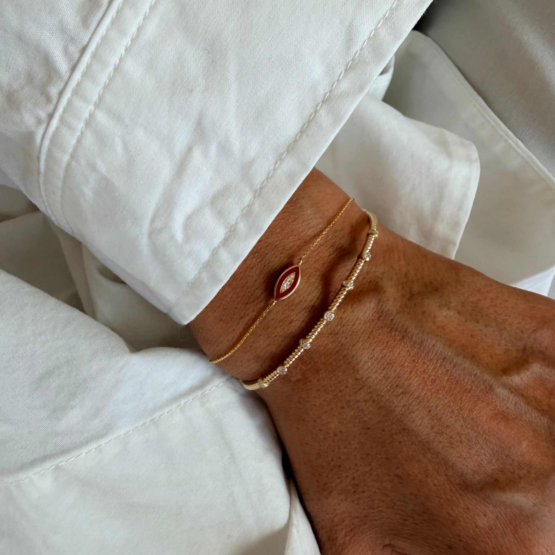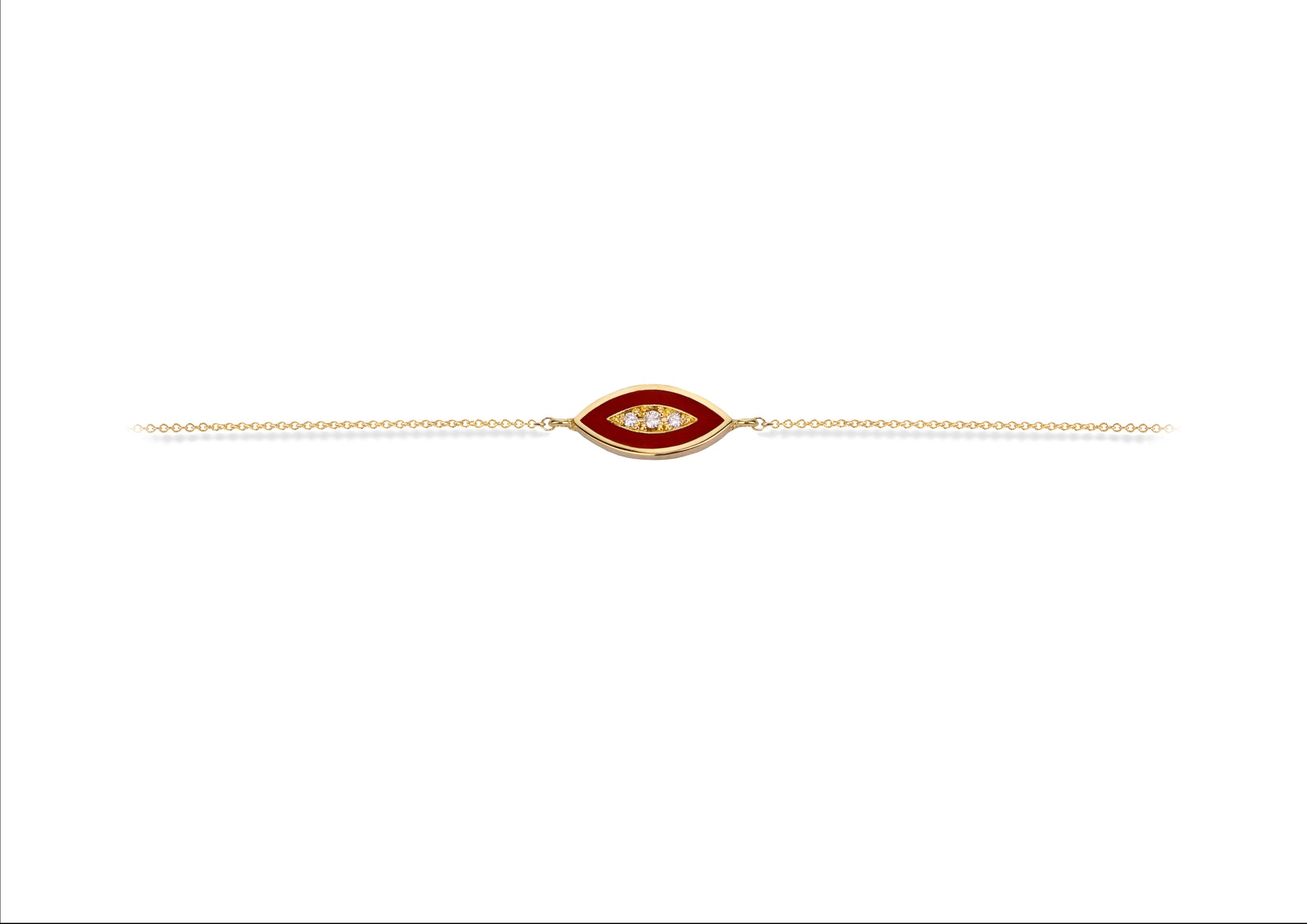 14K Gold Chain Bracelet with Navette Red Enamel Diamond Motif