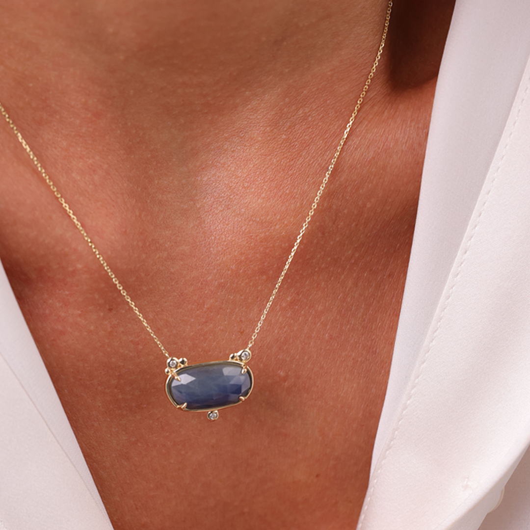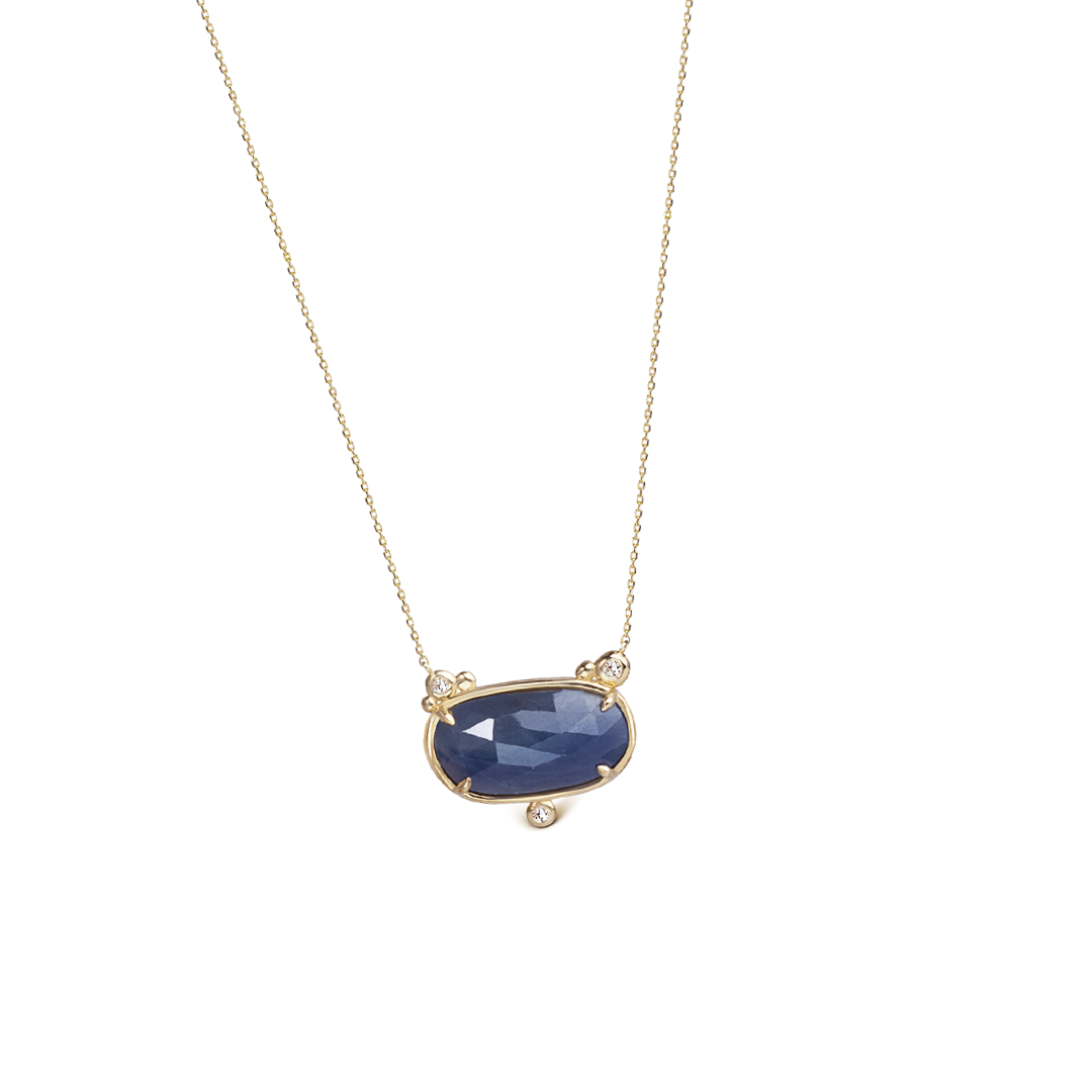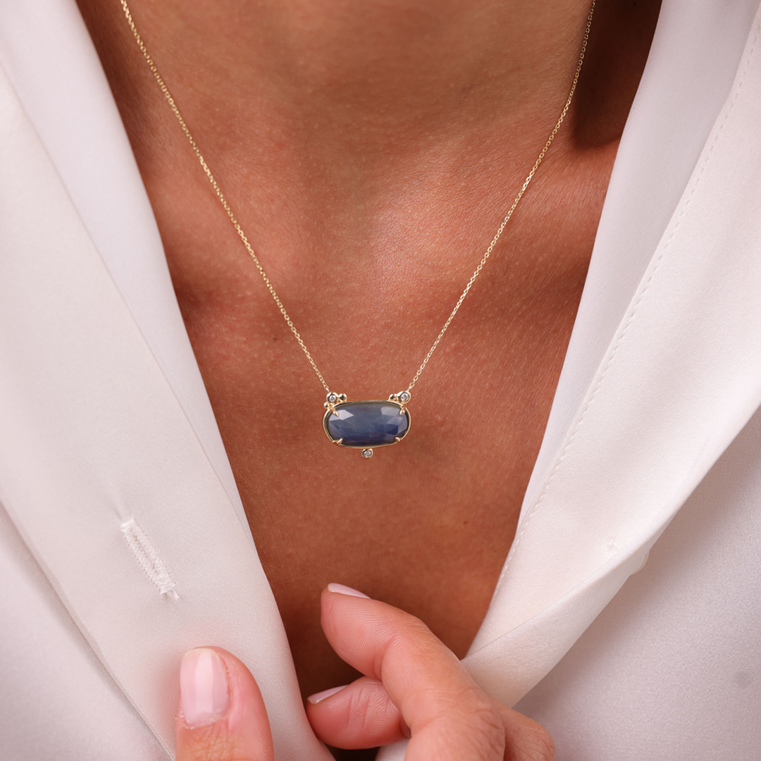 14K Gold Horizontal Sapphire Necklace with 3 diamonds