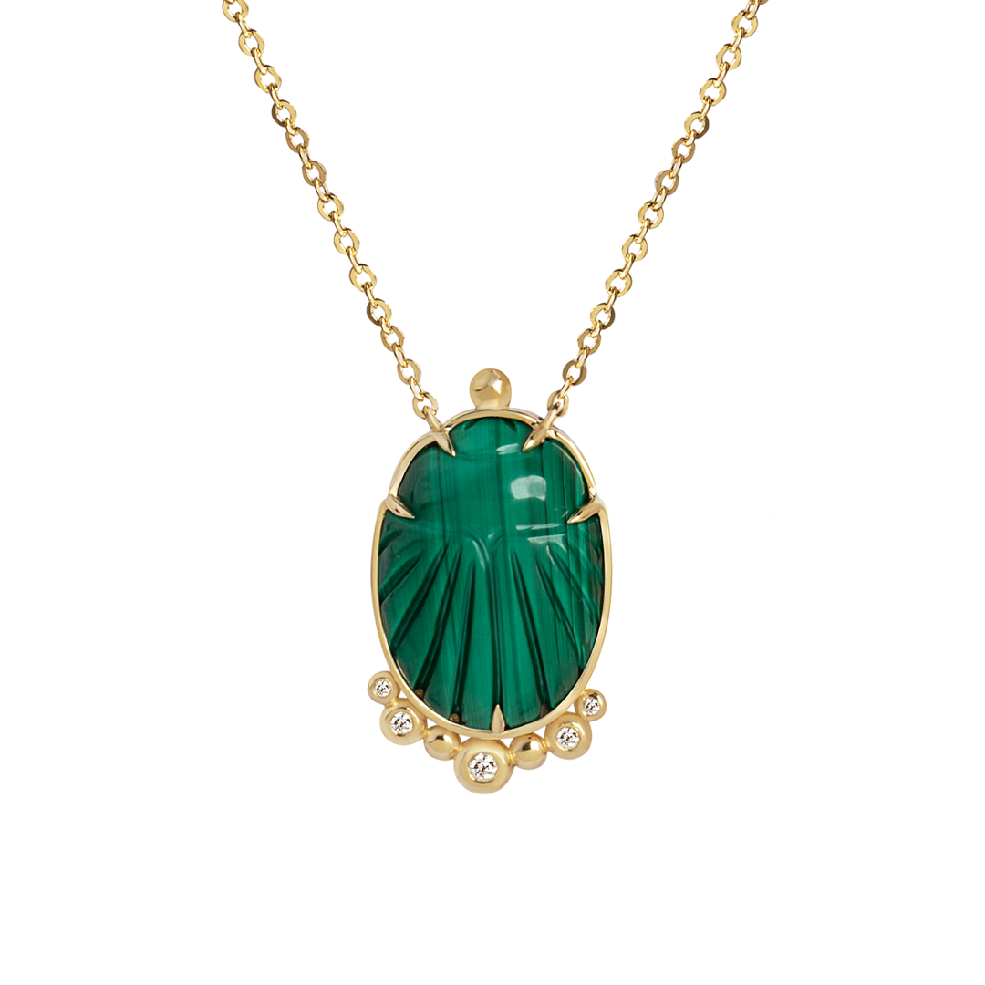 14K Gold Scarab Malachite Pendant Necklace with Diamonds
