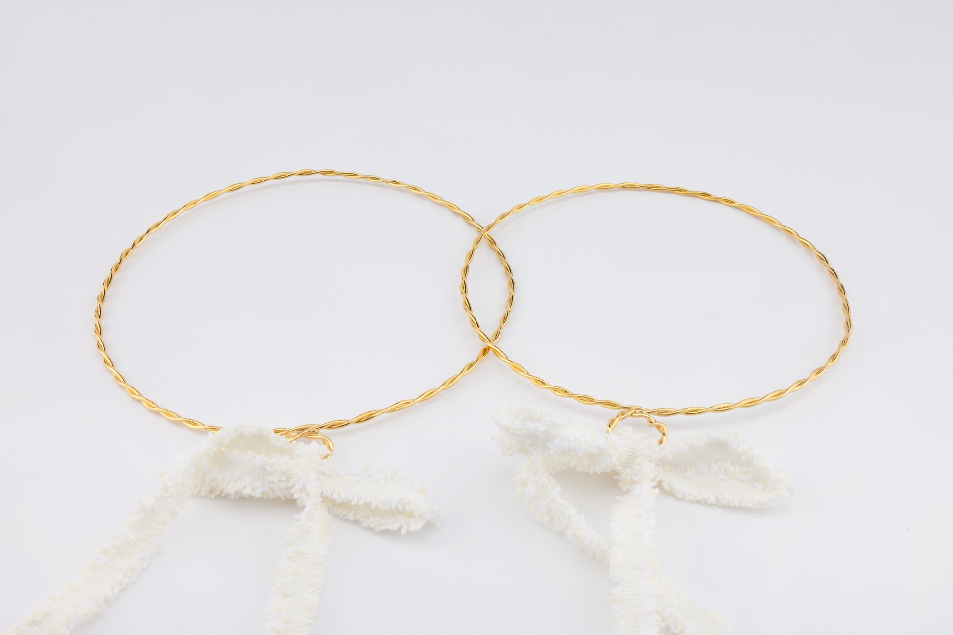 Designed with precision and elegance, these tightly twisted wedding crowns are crafted from gold-plated bronze and joined together with soft, white textured ribbons. The tight twist adds a bold, structured look, symbolizing the strength and unity of your marriage. With a luxurious gold finish and refined design, these crowns bring a timeless, sophisticated touch to your wedding day.