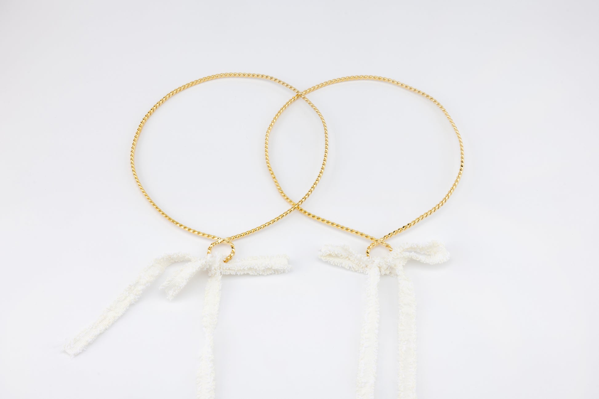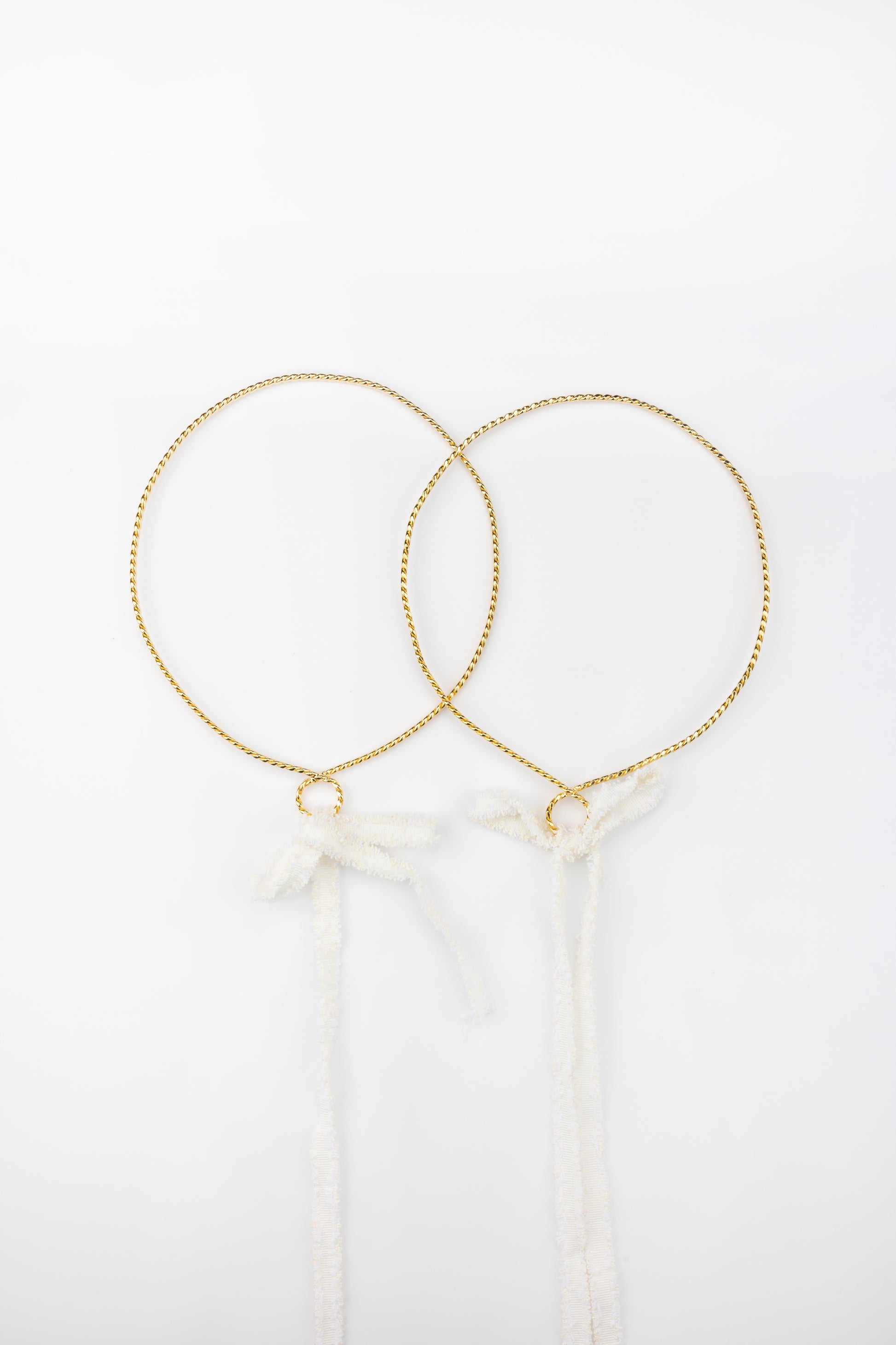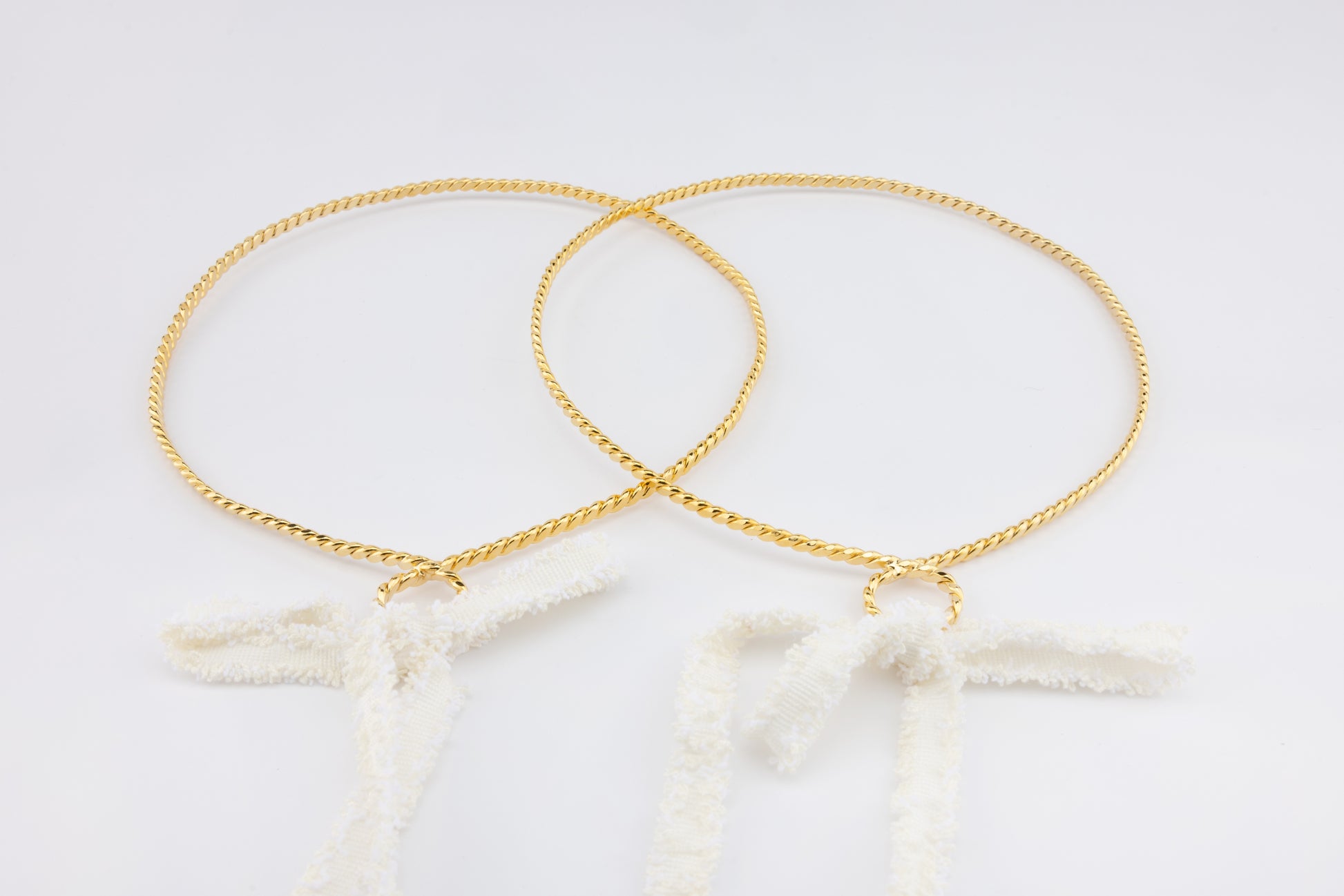 Crafted from gold-plated bronze, these densely twisted wedding crowns offer a rich, intricate design that symbolizes the deep connection and strength of marriage. Joined with soft, white textured ribbons, the dense twist creates a luxurious, captivating look that reflects both tradition and elegance. The radiant gold finish enhances the crowns’ timeless beauty, making them the perfect choice for a memorable and sophisticated wedding.