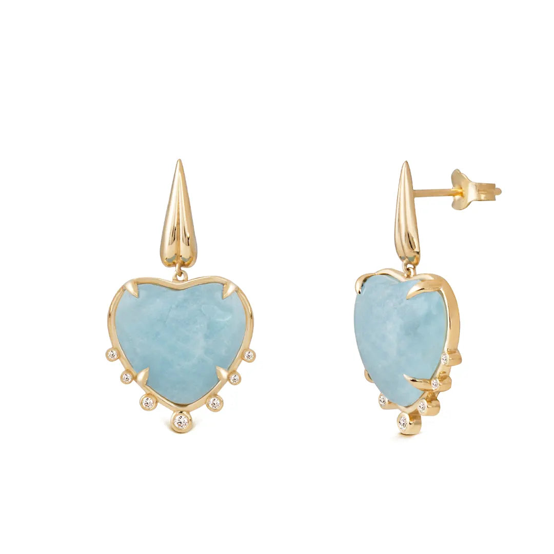 Heart Shaped Aquamarine 14K Gold Earrings with 7 Diamonds