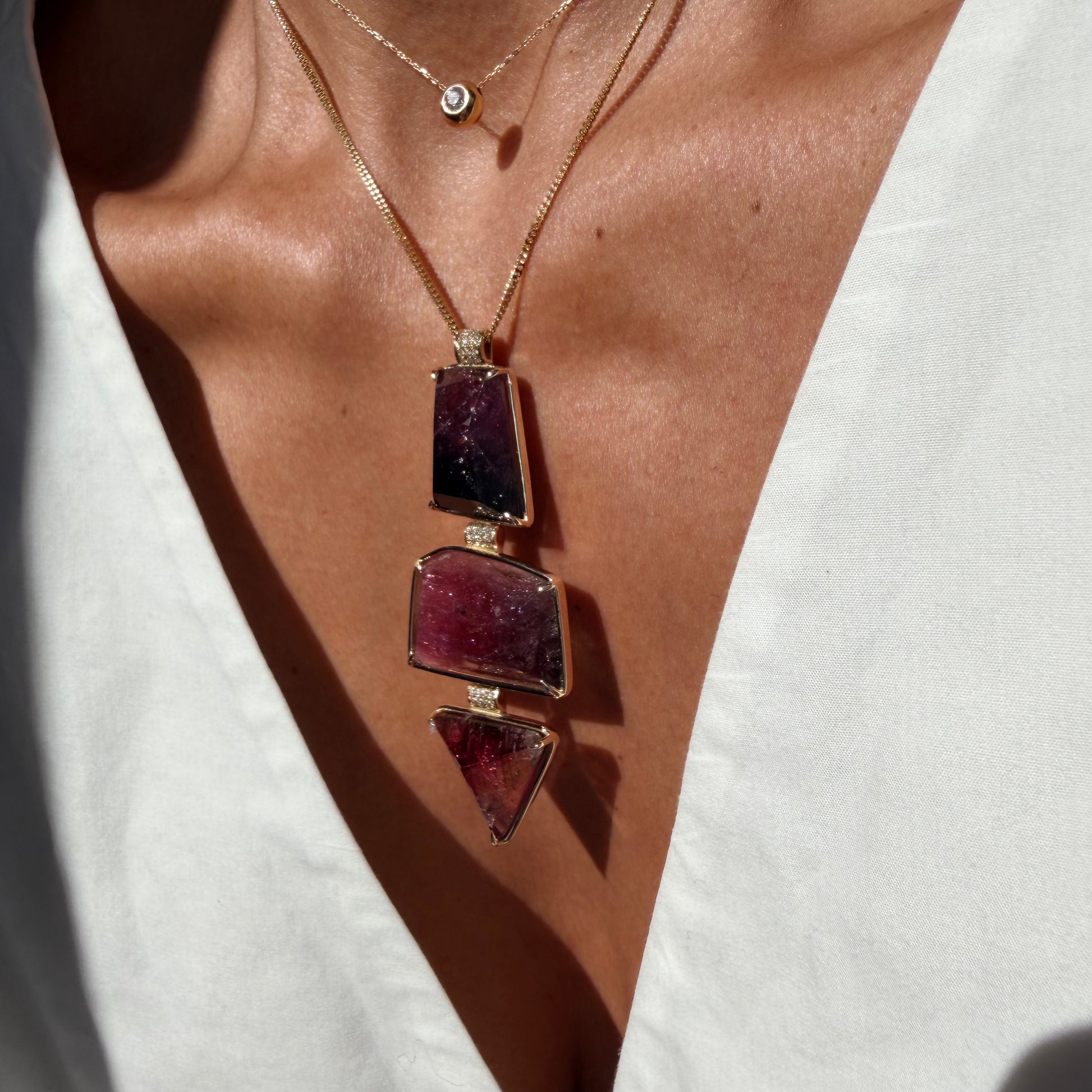 Delicate diamond accents add subtle brilliance and elevate the modern design, creating a refined balance between raw elegance and luxury. The vertical arrangement of the stones gives the pendant a bold yet graceful presence, perfect for both everyday wear and special occasions.