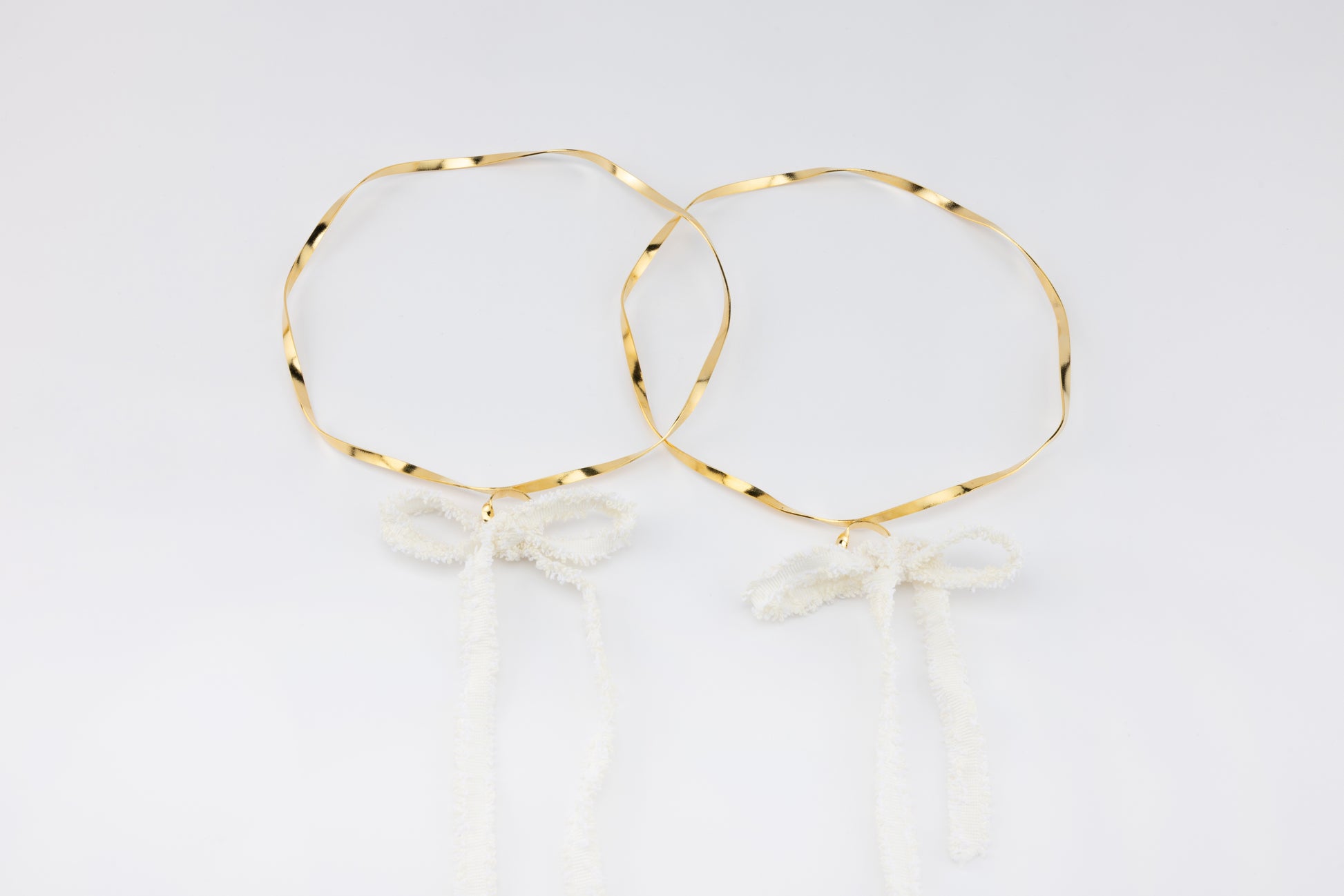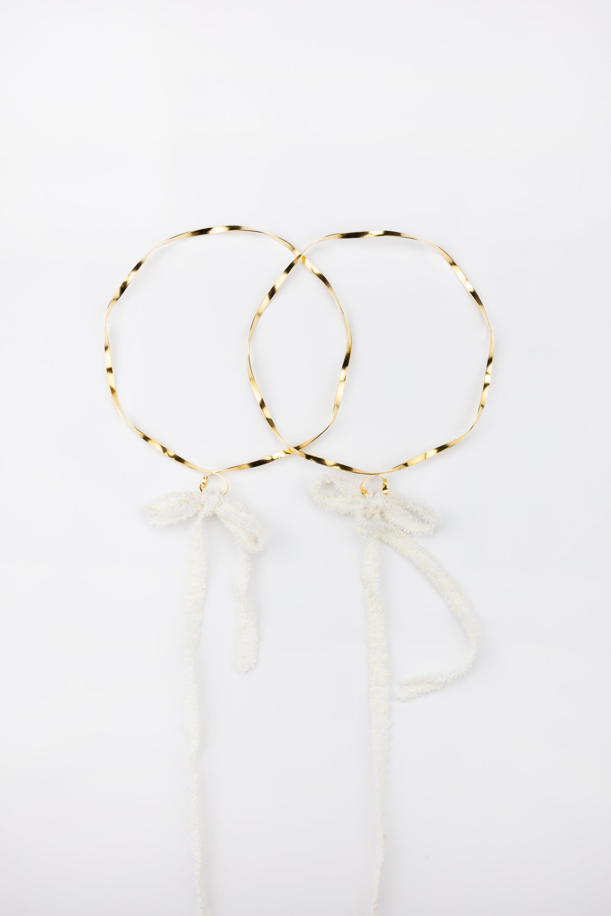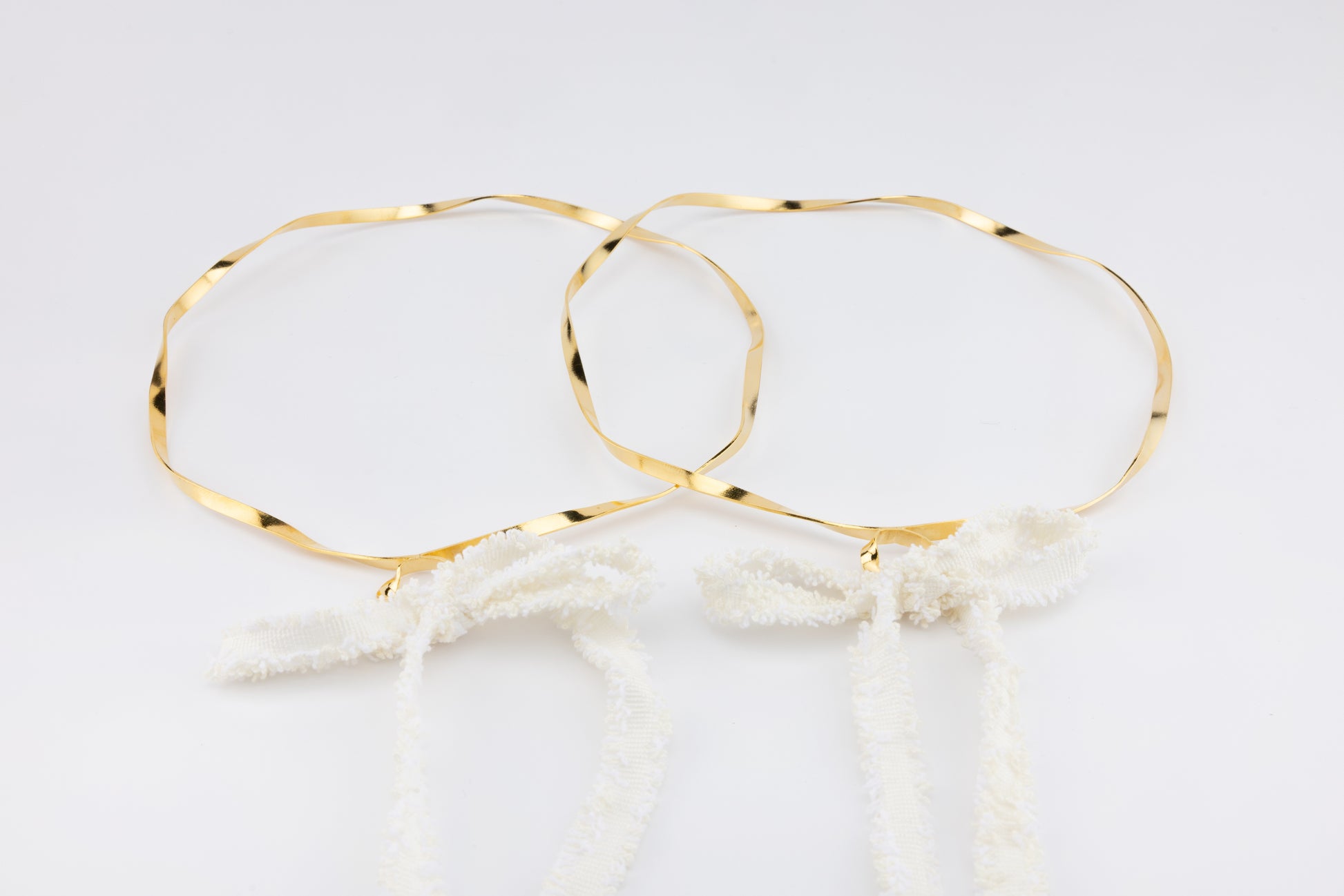 Crafted from gold-plated bronze, these flat twisted wedding crowns offer a unique, elegant design that combines a smooth, flat profile with a delicate twist. Joined with soft, white textured ribbons, the flat twist creates a balanced and refined look, symbolizing unity and eternal love. With a luxurious gold finish, these crowns add a timeless and sophisticated touch to your wedding day.