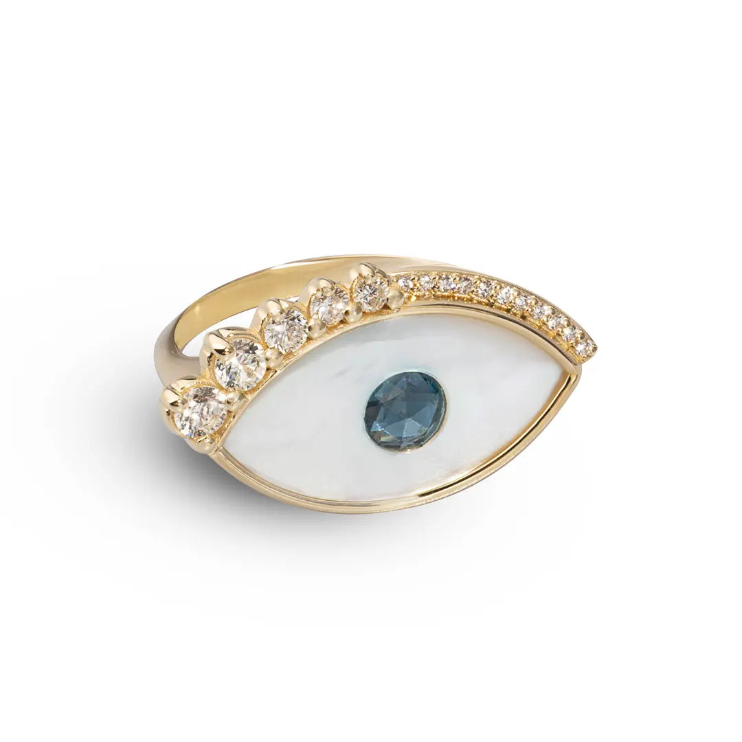 Hand-cast from 14-karat polished gold, inlaid with an evil eye made from Mother of Pearl, centered with a London Blue Topaz gemstone and traced with brilliant cut diamonds (0,38ct in total) that form illuminating lashes, this “Mati” ring (eye in Greek) is so timelessly chic that can be passed down through the generations.